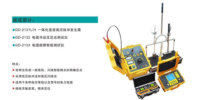 GD-2136系列電纜故障測(cè)試系統(tǒng)集成了測(cè)距、定點(diǎn)以及路徑探測(cè)等功能,能對(duì)電纜的高阻閃絡(luò)故障、高低阻性的接地、短路和電纜的斷線(xiàn),接觸不良等故障進(jìn)行測(cè)試,適用于測(cè)試各種不同型號(hào)、不同電壓等級(jí)的電力電纜及通信電纜。