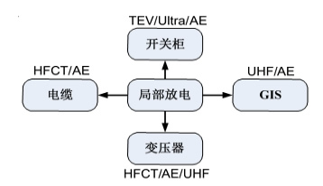 (1) 同時(shí)采用超高頻(UHF、地電波(TEV、非接觸式超聲波(US、接觸式超 AE和高頻電HFCT技術(shù),以上傳感技術(shù)對(duì)各種電力設(shè)備的局部放電 均具有針對(duì)性,聯(lián)合測(cè)量結(jié)果更加準(zhǔn)確。