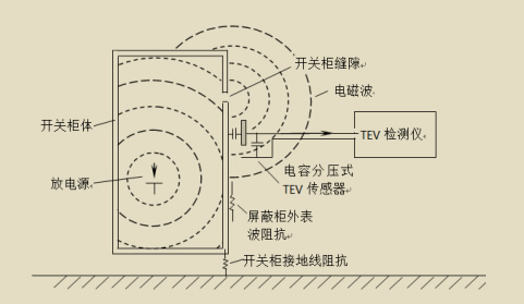 高壓開(kāi)關(guān)柜發(fā)生局部放電時(shí),放電量往往先聚集在與接地點(diǎn)相鄰的接地金屬部位,形成對(duì)地電流,在設(shè)備的金屬表面上傳播。對(duì)于內(nèi)部放電,放電量聚集在接地屏蔽的內(nèi)表面,屏蔽連續(xù)時(shí)在設(shè)備外部很難檢測(cè)到放電信號(hào),但屏蔽層通常在絕緣部位、墊圈連接、電纜絕緣終端等部位不連續(xù),局部放電的高頻信號(hào)會(huì)由此傳輸?shù)皆O(shè)備屏蔽外殼。根據(jù)麥克斯韋電磁場(chǎng)理論,局部放電現(xiàn)象的發(fā)生產(chǎn)生出變化的電場(chǎng),變化的電場(chǎng)激起磁場(chǎng),而變化的磁場(chǎng)又會(huì)感應(yīng)出電場(chǎng),這樣,交變的電場(chǎng)與磁場(chǎng)相互激發(fā)并向外傳播,形成了電磁波。當(dāng)開(kāi)關(guān)柜的內(nèi)部元件對(duì)地絕緣發(fā)生局部放電時(shí),小部分放電能量會(huì)以電磁波的形式轉(zhuǎn)移到柜體的金屬鎧裝上,因柜體接地,電磁波在開(kāi)關(guān)柜外表面感應(yīng)出高頻電流,利用電容耦合即可測(cè)出放電脈沖信號(hào)。